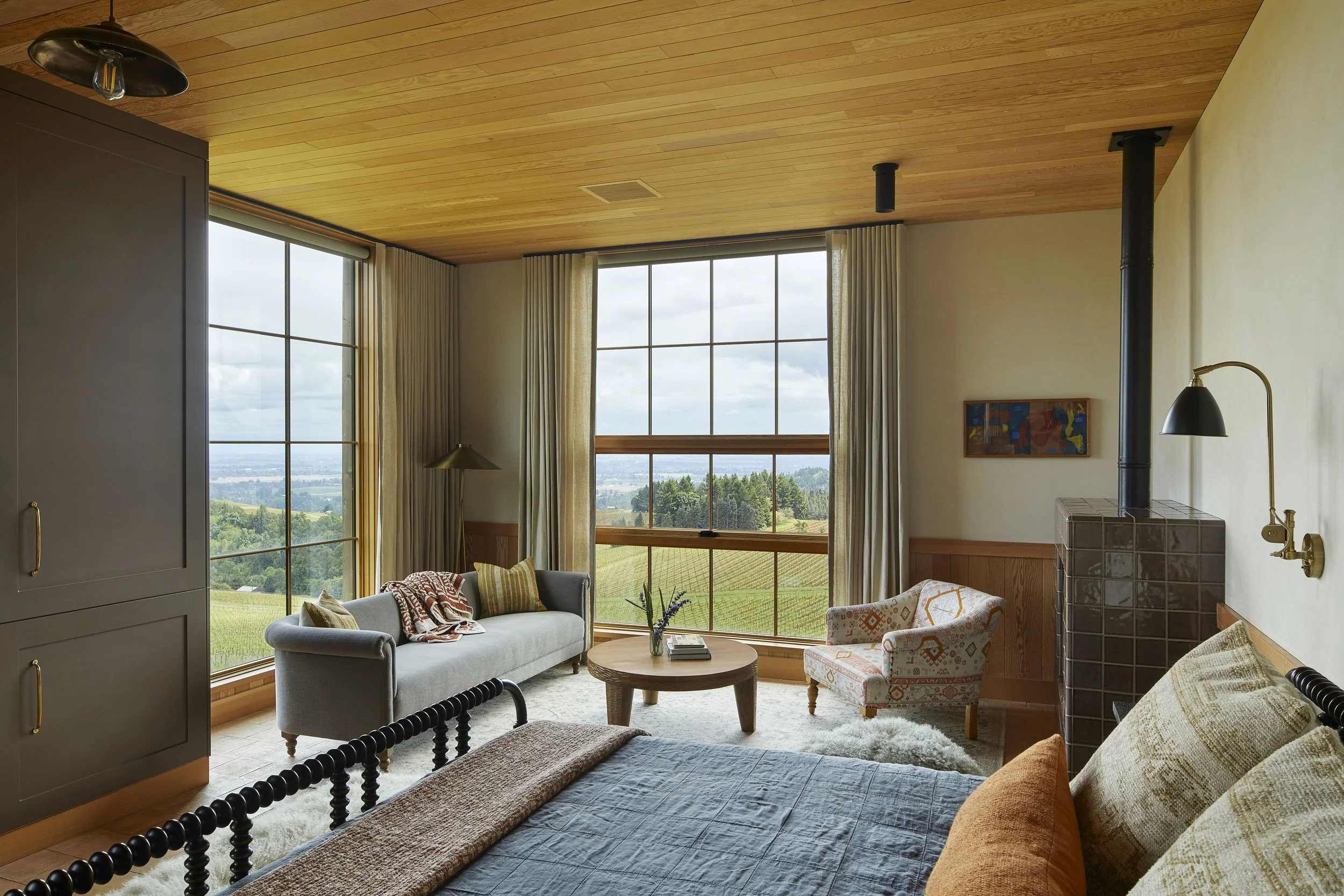 The Grange invites guests to encounter the Willamette Valley through authentic, wine-centered experiences with a distinct Oregonian identity. Hewn from Willamette Valley natural stone and black walnut, the building forms are rooted in a timeless agricultural vernacular. Their shapes are tucked into the hillside between vineyards, engaging unparalleled views of the Valley and the Cascade Mountains beyond. Restored oak savanna fills the space between vineyards, winery, and owner’s residence, re-establishing a connection to this land’s earlier state. The result is a sense of arrival, prospect, and belonging - a feeling that these structures have always been here and will remain so for years to come.